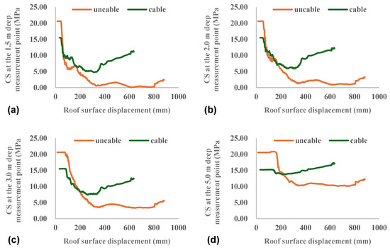 Variation in CS of internal measurement points with roof surface displacement. Note: (a) shows the variation in CS of the 1.5 m deep measurement point; (b) shows the variation in CS of the 2.0 m deep measurement point; (c) shows the variation in CS of the 3.0 m deep measurement point; (d) shows the variation in CS of the 5.0 m deep measurement point.