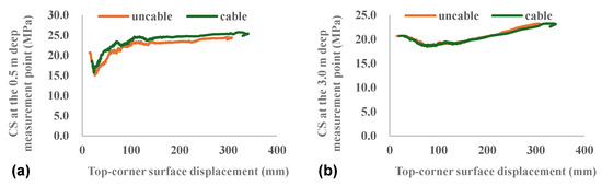 Variation in CS of internal measurement points with top-corner surface displacement. Note: (a) shows the variation in CS of the 0.5 m deep measurement point; (b) shows the variation in CS of the 3.0 m deep measurement point.