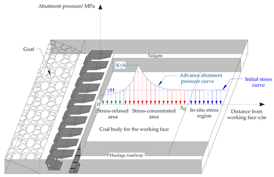 The in situ stress conditions near the working face 31305 were determined using the hollow inclusion stress relief method, as presented in Table 3. Based on the measurement results: (a) the maximum and minimum principal stresses are predominantly horizontal. For instance, the maximum principal stress angles at the two measurement stations are 6.9° and 8.2°, respectively, while the minimum principal stress angles are −11.9° and −2.5°, indicating near-horizontal orientations; (b) the intermediate principal stress is nearly vertical. The average angle between direction of the intermediate principal stress and the horizontal plane at two measurement points is 78.8°, and its magnitude is approximately equal to or slightly greater than the overburden pressure per unit area; (c) the direction of the maximum principal stress ranges from 114.6° to 136.0°. The strata in the mining area exhibit a gently inclined monocline structure, with a strike of approximately N40° to 50°E and a dip direction of 130° to 140°. The maximum principal stress direction is perpendicular to the axial direction of the fold structure and aligns with the dip direction of the coal seam. The 31305 working face is mined using the inclined longwall method, advancing along the dip direction of the coal seam. The gateway is oriented nearly perpendicular to the fold axis and thus aligned with the direction of the maximum horizontal stress. According to the maximum horizontal stress theory in bolt support, this layout of the working face entries is conducive to maintaining the stability of the surrounding rock, particularly that of the roof and floor [8,9].