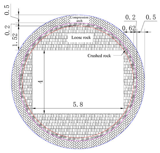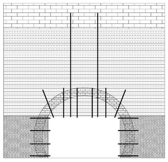 The main role of anchor cables is to prevent the crushed rock and loose rock in the roof (Figure 21) from subsiding on a large scale and reduce the subsidence of the anchorage zone due to gravity. If the cohesion and internal friction of the surrounding rock are relatively low, the row spacing of anchor cables should satisfy the following condition for mechanical equilibrium in the vertical direction: