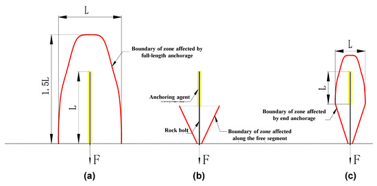 The pullout testing on the rock bolts shows that a single rock bolt has only a limited effect on the deformation of the surrounding rock and the affected zone is shaped like a jujube pit [20]. Figure 23a shows the boundary of the zone affected by full-length anchorage. It is found that this affected zone has a vertical extent about 1.5 times the anchorage length and a horizontal extent equal to the anchorage length [21]. When the resin-bonded bolt is installed by end anchorage or lengthened anchorage, the affected zone around the free bolt segment is cone-shaped [22], as shown in Figure 23b. Figure 23c depicts the whole zone affected by end anchorage or lengthened anchorage. The horizontal extent of this zone equals the anchorage length.