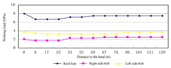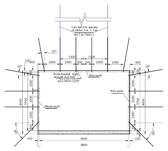 Figure 24 depicts the final design of rock bolting for the conveyor belt roadway. The specific parameters are as follows: (a) the number of roof bolts in a row, 6; the number of side bolts in a row, 4; HRB335 steel bolt with a left-handed thread and no longitudinal rib, φ22 × 2200 mm; line and row spacing of rock bolts, 1000 × 1000 mm; (b) the number of anchor cables in a row, 2; anchor cable formed of steel strands, φ17.8 × 7300 mm, with tensile strength of 1860 MPa or greater; line and row spacing of cables, 3000 × 3000 mm; (c) plastic mesh for the left side (viewed in the direction of tunneling), and wire mesh for other surfaces; (d) one piece of CK2360 resin anchoring agent for each rock bolt, and three for each anchor cable; (e) 3.0 m long beams made of round steel rods and with trapezoidal cross-section for connecting adjacent cables.