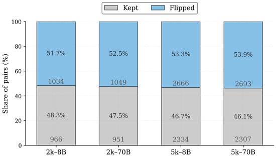Figure 1, on a 2k subset, the 8B LLM teacher flips 1034/2000 pairs (≈51.7%) and the 70B LLM teacher flips 1049/2000 (≈52.5%); on a 5k subset, the 8B flips 2666/5000 (≈53.3%) and the 70B flips 2693/5000 (≈53.9%). These rates indicate that RLAIF labels can be both noisy and biased relative to the human test distribution.