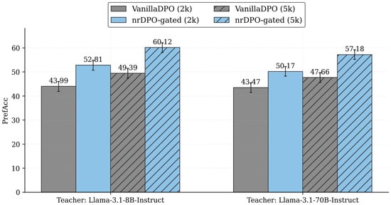 Table 7. Across both teachers, for 2k AI-labeled dataset, nrDPO-gated is the only configuration that consistently lifts performance: with the 8B teacher, it reaches 52.81% (95% CI 50.74–54.84), compared to 43.99% (41.91–46.02) for vanilla DPO and 45.59% (43.51–47.62) for the standard nrDPO. With the 70B teacher, it remains best at 50.17% (48.18–52.21), again exceeding vanilla DPO (43.47%, 41.48–45.50) and nrDPO (42.99%, 40.96–45.03). In both cases, the confidence intervals of nrDPO-gated do not overlap with those of the baselines, indicating statistically robust improvements. Scaling RLAIF to a 5k relabeled subset preserves—and amplifies—this trend: nrDPO-gated attains 60.12% (58.13–62.11) with the 8B teacher and 57.18% (55.19–59.21) with the 70B teacher, outperforming vanilla DPO (49.39%/47.66%) and nrDPO (50.26%/47.02%) by approximately +9–11 points. In all settings, the gated model’s confidence intervals do not overlap with the baselines, indicating statistically robust gains from intrinsic-confidence gating under RLAIF.