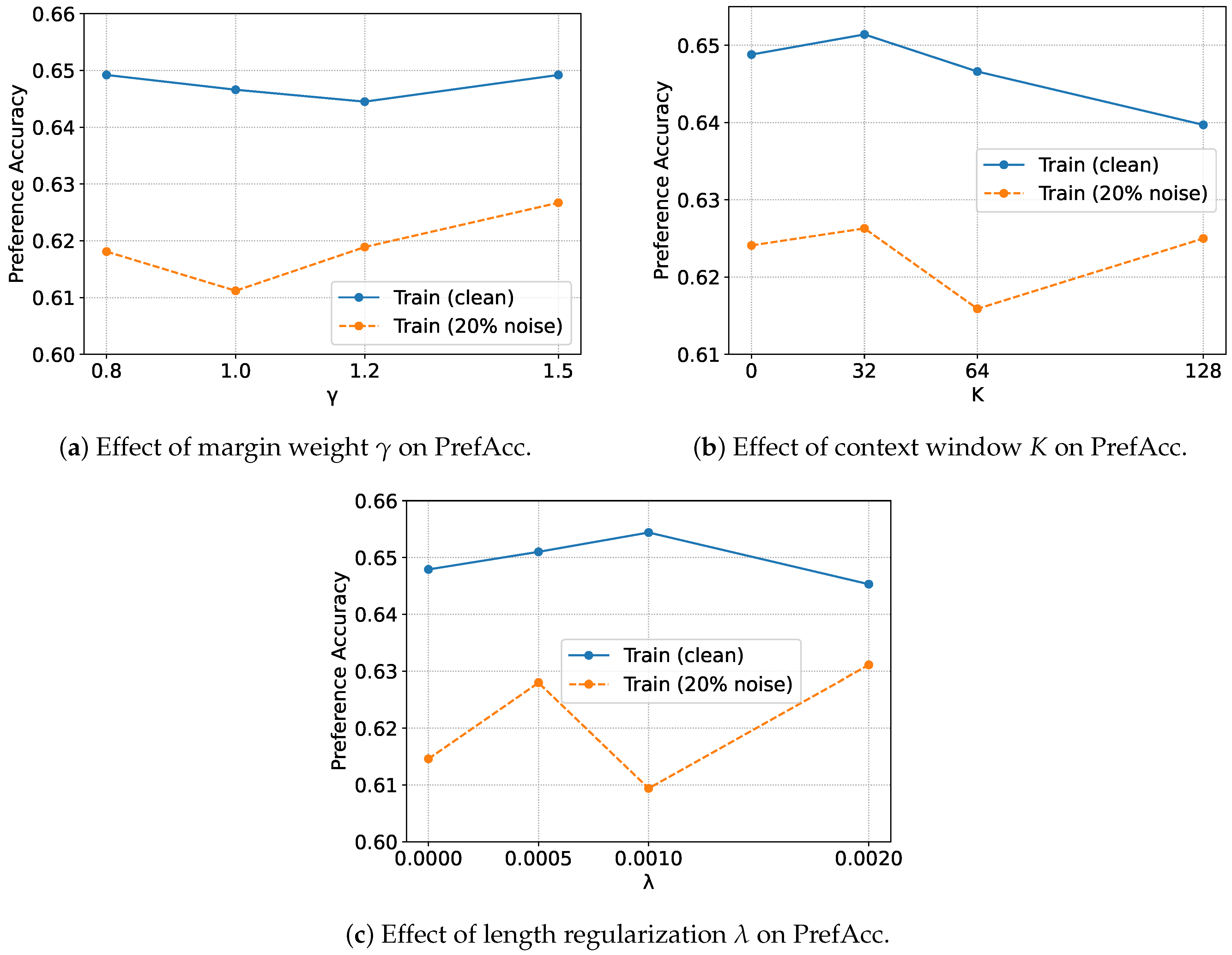 Hyper-parameters (robust defaults). Margin weight (increase under noise); context window ; length regularization ; DPO temperature .