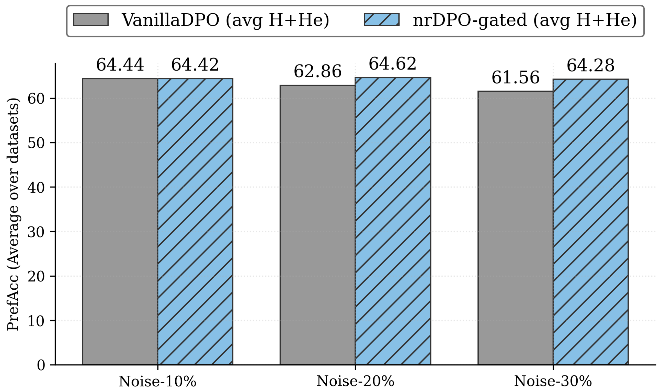Figure 3), nrDPO-gated is almost equal to vanilla DPO at 10% noise, but surpasses vanilla DPO by approx. +1.8 pp at 20% and approx. +2.7 pp at 30%. On average, across datasets, nrDPO-gated is robust to label noise, matching vanilla DPO at low noise and outperforming it substantially at medium/high noise.