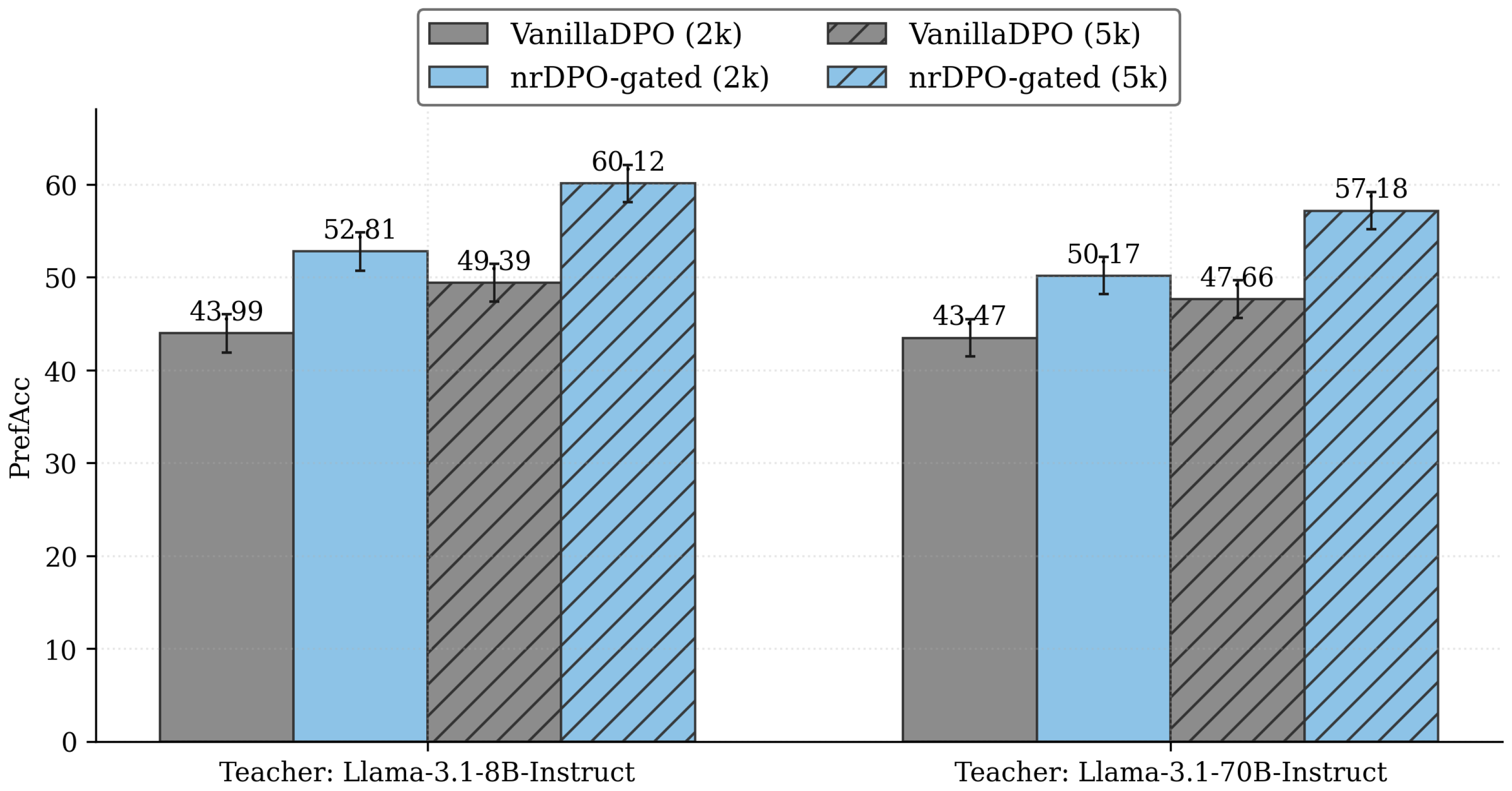Table 7. Across both teachers, for 2k AI-labeled dataset, nrDPO-gated is the only configuration that consistently lifts performance: with the 8B teacher, it reaches 52.81% (95% CI 50.74–54.84), compared to 43.99% (41.91–46.02) for vanilla DPO and 45.59% (43.51–47.62) for the standard nrDPO. With the 70B teacher, it remains best at 50.17% (48.18–52.21), again exceeding vanilla DPO (43.47%, 41.48–45.50) and nrDPO (42.99%, 40.96–45.03). In both cases, the confidence intervals of nrDPO-gated do not overlap with those of the baselines, indicating statistically robust improvements. Scaling RLAIF to a 5k relabeled subset preserves—and amplifies—this trend: nrDPO-gated attains 60.12% (58.13–62.11) with the 8B teacher and 57.18% (55.19–59.21) with the 70B teacher, outperforming vanilla DPO (49.39%/47.66%) and nrDPO (50.26%/47.02%) by approximately +9–11 points. In all settings, the gated model’s confidence intervals do not overlap with the baselines, indicating statistically robust gains from intrinsic-confidence gating under RLAIF.