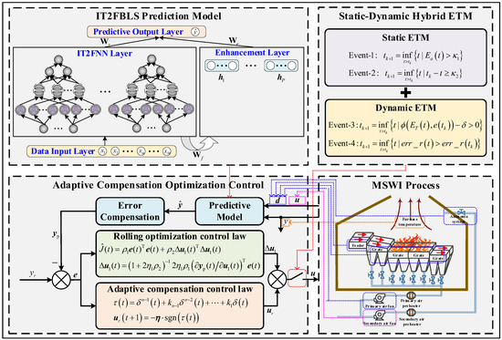 Municipal solid waste incineration (MSWI) plays a key role in advancing environmental sustainability. However, the current main furnace temperature control methods are difficult to solve the problems of strong coupling, equipment wear, and frequent disturbances. To solve the above problems, in this article, we propose a static and dynamic hybrid event-triggering mechanism-based interval type-II fuzzy broad adaptive compensation model predictive control (SDHETM-IT2FB-ACMPC). Firstly, a furnace temperature prediction model based on the interval type-2 fuzzy broad learning system (IT2FBLS) is constructed, and the IT2FB-MPC method is obtained, which solve the problem of variable coupling. Secondly, DETM based on historical error information is designed using sliding window method and combined with SETM to form SDHETM to drive the update of control variable to reduce the problem of equipment wear. Finally, the adaptive compensation control law of the adaptive compensation optimization control (ACOC) algorithm can compensate for the influence of the disturbance and the event-triggered mechanism on the control effect, and overcome the problem of frequent disturbances. Experimental results show that the proposed method reduces ISE to 0.2821, IAE to 0.1930, and DEVmax to 6.6269—reductions of 79%, 59%, and 8% compared to traditional NMPC—while cutting control actions by 71%. The results prove that IT2FB-MPC has excellent control performance for furnace temperature, and that SDHETM and ACOC can effectively reduce the triggering times and effectively compensate for the influence caused by disturbances and the lack of control variable updates. The proposed method successfully solves the control difficulties of furnace temperature in the MSWI process.
