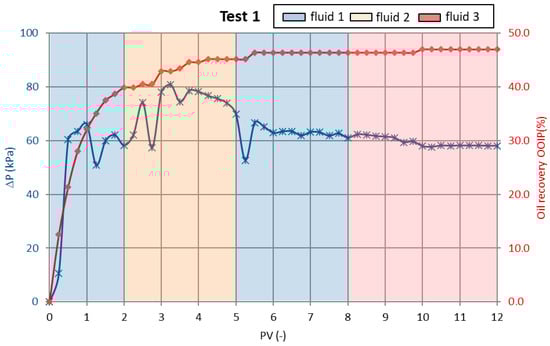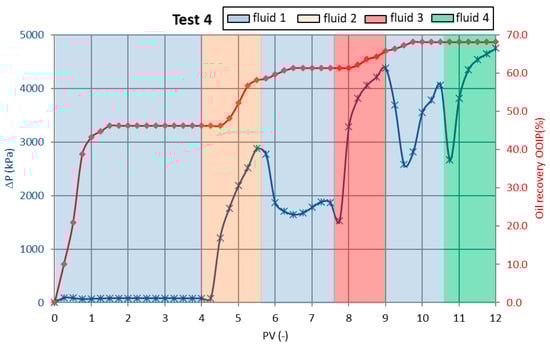 The fourth and final test in the presented series yielded the highest oil recovery of all formulations tested. The displacement fluid contained 0.1–0.5 wt% polymer and 2 wt% nanoemulsion. This combination achieved an oil recovery factor of 68.2% OOIP. The displacement occurred more gradually compared to earlier tests, with peak recovery reached after injecting more than 9 pore volumes of solution. The improvement in recovery was substantial—an increase of 21.2 percentage points compared to the first test with low polymer concentration. Because the polymer was added to three fluids, there was also a significant increase in differential pressure to a maximum value of 4752 kPa at the end of the test. Such high pressures could pose challenges in field applications, especially in formations with lower fracture gradients. Careful pressure monitoring and stepwise injection strategies would be necessary to mitigate potential injectivity issues or formation damage in the field.