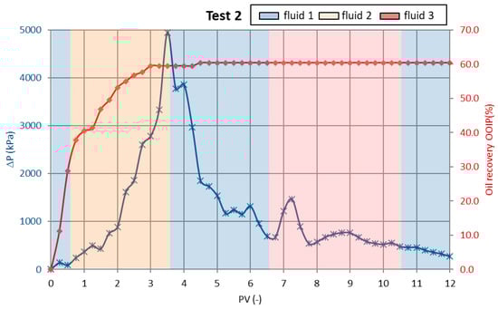 In the second test, the injection fluid was prepared by adding 0.5 wt% TN-16988 polymer and 2 wt% D66 nanoemulsion to reservoir water. This formulation resulted in a significant improvement in oil recovery, reaching 60.4% of the original oil in place (OOIP). Simultaneously, a reduction in differential pressure was observed, with an initial value of 4949 kPa and a final value of 270 kPa at the end of the injection process.