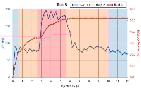 In the third test, the nanoemulsion concentration was reduced to 1 wt%, while maintaining the polymer concentration at 0.5 wt%. As shown in Figure 3, this led to a decrease in the oil recovery factor to 51.9%, representing a 8.5 percentage point reduction compared to the previous test. These results suggest that lower concentrations of active components can extend the duration of the displacement process, allowing for more effective oil mobilization and sweep efficiency.