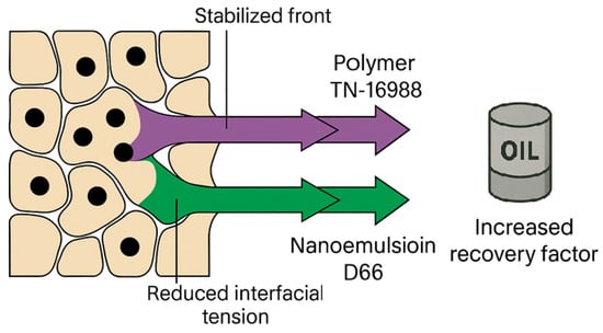 We conducted a series of laboratory studies to evaluate the effectiveness of enhanced oil recovery (EOR) using polymer–nanoemulsion solutions. This formulation benefits from the synergy between components: the polymer (TN-16988) increases the viscosity of the displacing fluid and stabilizes the displacement front, while the nanoemulsion (D66) reduces interfacial tension and alters pore surface wettability. These mechanisms work together to improve both microscopic and macroscopic sweep efficiencies, leading to more effective oil displacement (see Figure 5).