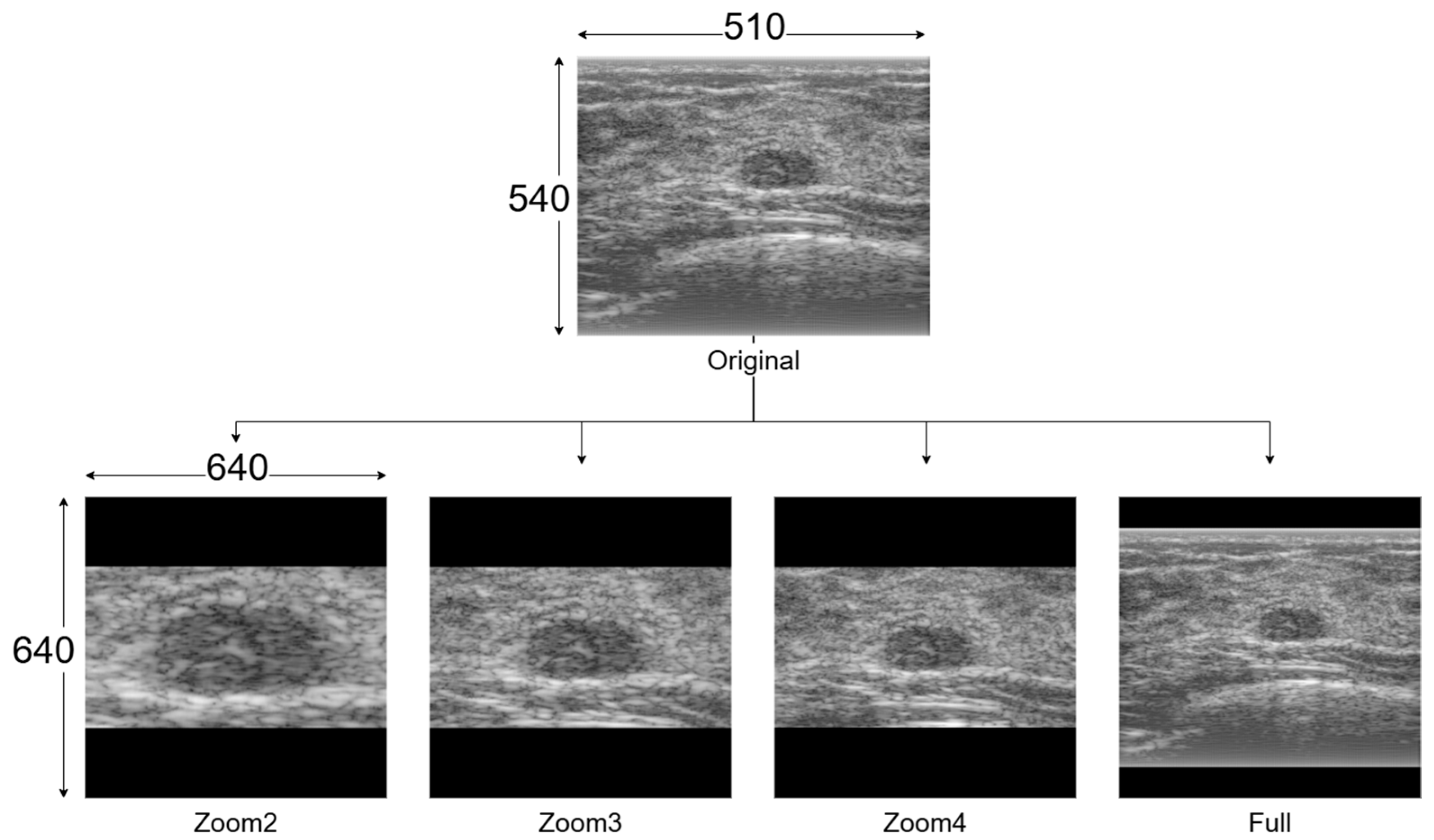 In this study, using the ratio of the tumor to the background in B-mode images, we created an ‘N-fold Expanded Bounding Box’ by expanding the width and height of the tumor’s bounding box by a factor of N (where N = 2, 3, and 4 in this study). We then cropped these areas to generate a total of four versions of one B-mode image: zoom2, zoom3, zoom4, and full images. During this process, expansion beyond the original image boundaries was omitted to prevent unnecessary distortion of information. Through this cropping method, up to three additional hierarchically zoomed-in images are generated from a single B-mode image.