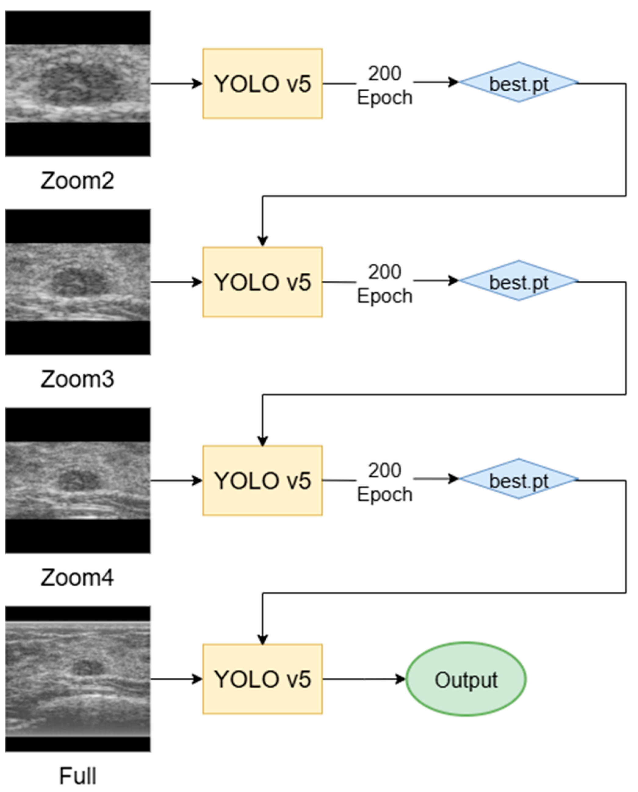 Most deep learning models, including YOLO, require a fixed-size input image. In the case of the YOLOv5 model, if an input image is smaller than the default 640 × 640 resolution, it is normalized through interpolation, and if larger, the model divides it into 640 × 640 segments to perform object detection. Applying this detection method directly to ultrasound images has a drawback: it can reduce training efficiency because a segmented image might contain only a part of a tumor or no tumor at all. Therefore, in this study, we preprocessed all images from every stage of the curriculum (zoom2, zoom3, zoom4, and full images) by consistently normalizing them into the default input resolution of 640 × 640. This ensures that the object detection algorithm is applied only once to each image.