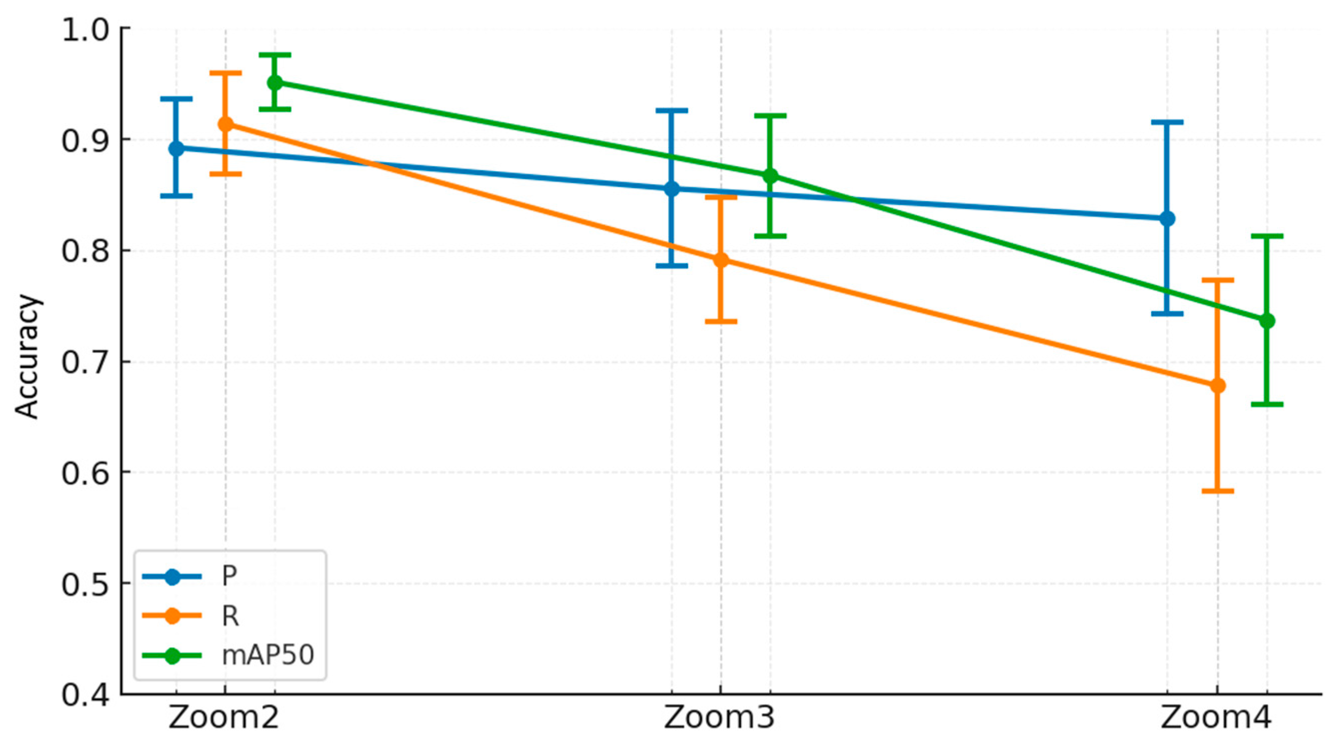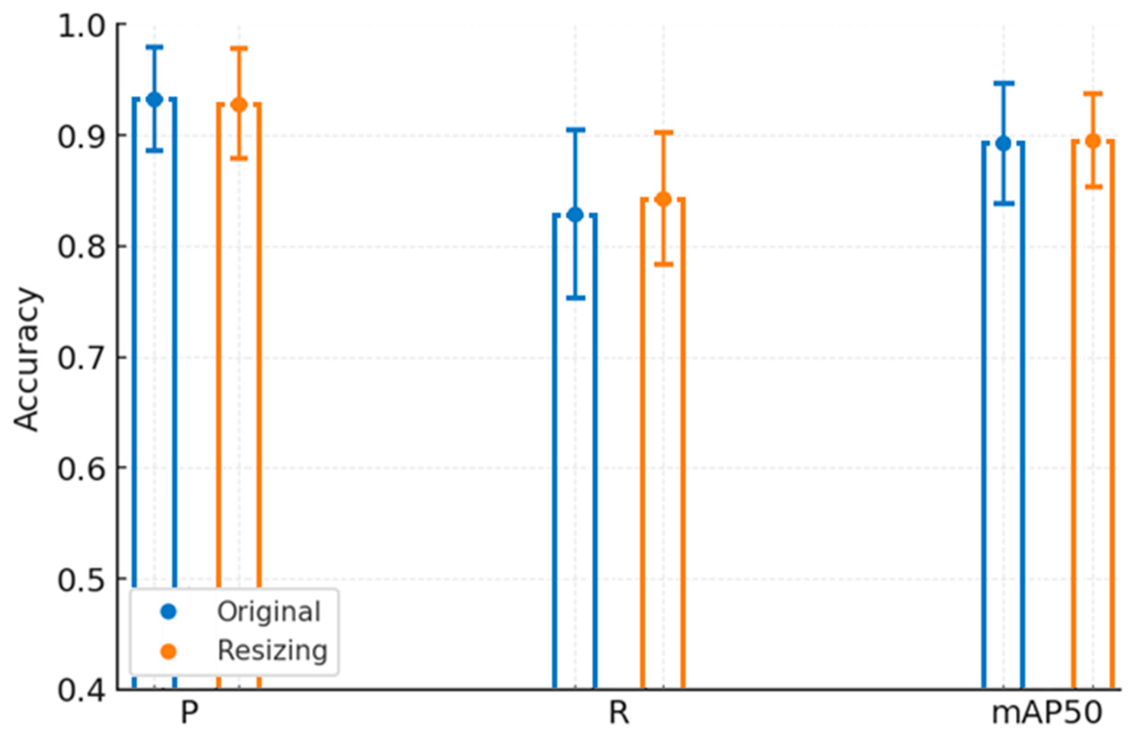 Table 2. While Precision remained largely unchanged, the mean values of Recall and mAP50 showed slight improvements. More notably, the standard deviations of both metrics decreased, indicating that the model with resizing applied demonstrates more stable and consistent performance.