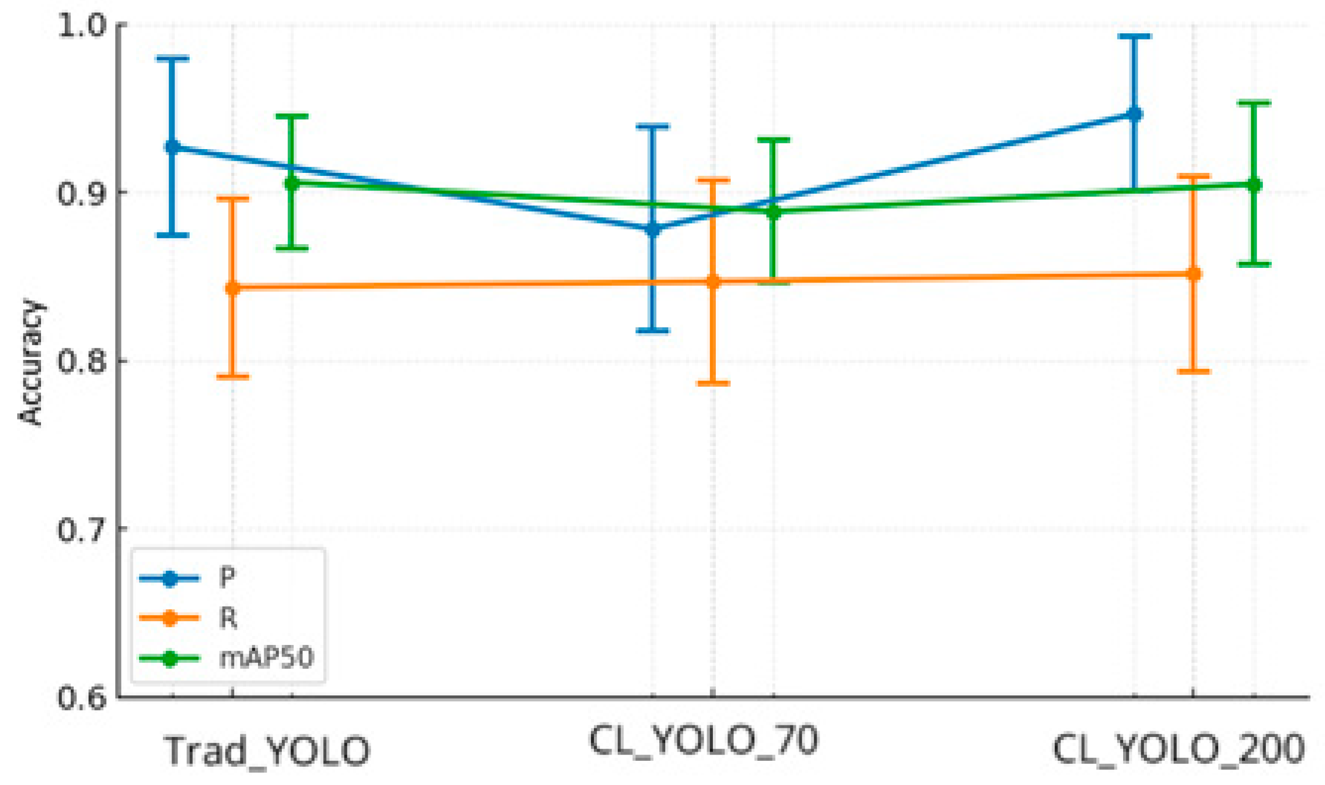 Figure 6. The simulation was repeated using 20 different seeds to split the training and test datasets. Trad_YOLO was trained for a total of 200 epochs, while CL_YOLO was trained in two scenarios: 70 epochs per stage and 200 epochs per stage. We then compared the median and dispersion metrics (standard deviation, IQR) of mAP50, precision, recall, and F1-score.