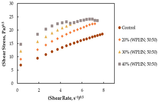 In contrast, high IN samples (e.g., 70% IN at 40% substitution) increased yield stress, but not to the same extent. IN appears to increase matrix thickness without substantially enhancing internal bonding. Interestingly, samples containing a balanced WPI:IN ratio (50:50) consistently showed the lowest increase in yield stress across substitution levels. This suggests a compositional synergy, where the opposing rheological contributions of WPI (network-forming) and IN (dispersed-phase thickener) may counterbalance each other.