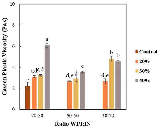 Figure 2 presents the Casson plastic viscosity across different substitution levels (20%, 30%, 40%) and WPI:IN ratios (70:30, 50:50, 30:70). Viscosity, which quantifies the resistance of a fluid to deformation under shear stress, serves as a direct indicator of the energy required to maintain flow.