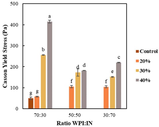 Casson yield stress of chocolate samples with varying levels of CB substitution—20%, 30%, 40% and varying WPI:IN ratios: 70:30, 50:50, 30:70. Values with different alphabetical letters differ significantly (p < 0.05).