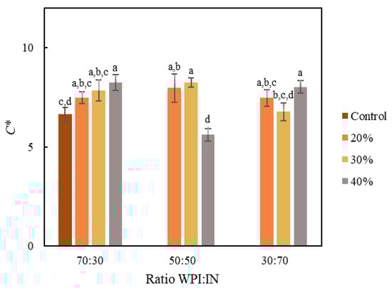 Color intensity (C*) of chocolate samples with varying levels of CB substitution—20%, 30%, 40% and varying WPI:IN ratios: 70:30, 50:50, 30:70. Values with different alphabetical letters differ significantly (p < 0.05).