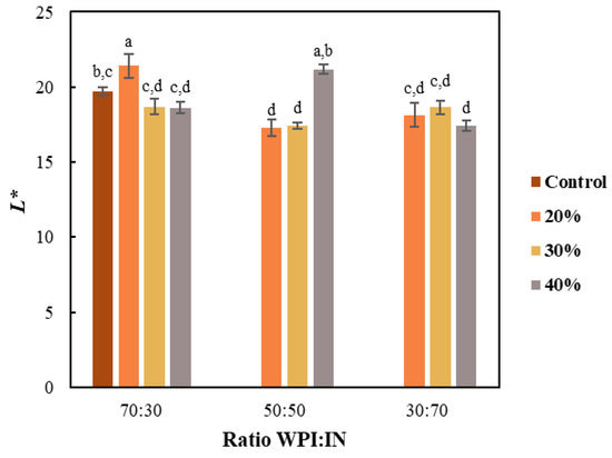Brightness (L*) of chocolate samples with varying levels of CB substitution—20%, 30%, 40% and varying WPI:IN ratios: 70:30, 50:50, 30:70. Values with different alphabetical letters differ significantly (p < 0.05).