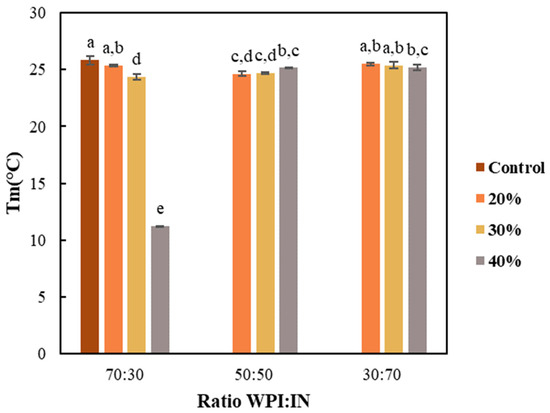 When examining the influence of the WPI:IN ratio, results varied across groups. In the 50:50 and 30:70 WPI:IN formulations, melting points remained consistent regardless of substitution level, indicating that the type and amount of substitute had minimal impact on the thermal behavior of the chocolate matrix. However, in the 70:30 WPI:IN group isolated differences were observed, especially between the 30% and 40% substitution levels, where a slight decrease in Tm was recorded. This drop may be due to batch-specific crystallization inconsistencies or localized disruptions in fat crystallization caused by higher concentrations of WPI, which has been reported to interfere with fat structuring due to its hydrophilic nature.