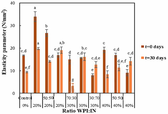 Modulus of elasticity of chocolate samples with varying levels of CB substitution—20%, 30%, 40% and varying WPI:IN ratios: 70:30, 50:50, 30:70. Values with different alphabetical letters differ significantly (p < 0.05).