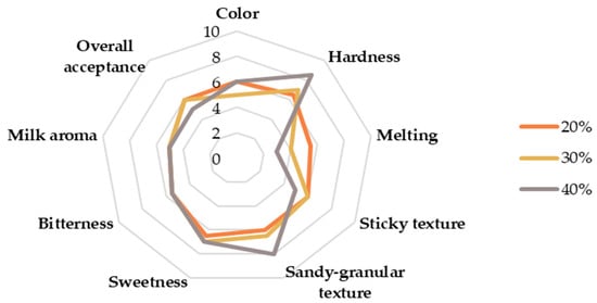 The chocolate samples were randomly assigned three-digit codes and placed on white plates before being presented to the sensory panel, accompanied by a glass of water to cleanse the palate between tastings. Evaluation was conducted using the traditional 9-point scale, where 1 represents the lowest and 9 the highest level of intensity. The sensory attributes assessed included appearance, taste, texture, aroma, and overall acceptability. A total of ten trained panelists, both men and women, participated in the evaluation. The first sensory trial aimed to compare samples with three different levels of CB substitution: 20%, 30%, and 40%. In all cases, the fat replacers were used at a fixed ratio of WPI:IN 50:50.