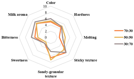 Granulometry perception, assessed through mouthfeel and oral disintegration, favored the AMP–PGPR sample. It was described as smoother and more cohesive, consistent with the particle dispersion benefits observed in rheological analyses. This is supported by earlier studies that identified improved dispersion and texture uniformity in emulsifier systems containing AMP, especially in fat-reduced chocolates [41,52].