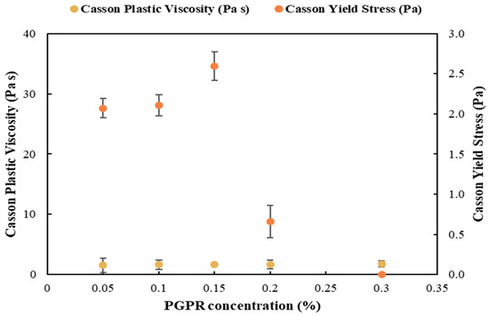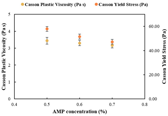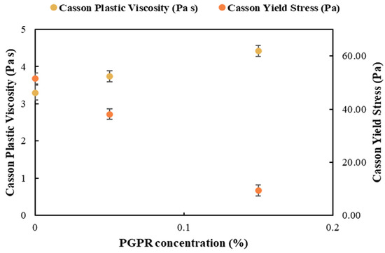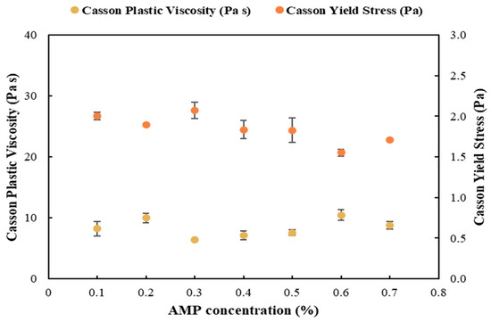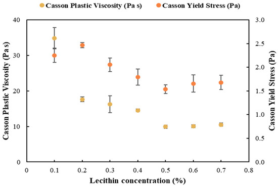 In the experiments investigating the effects of lecithin and AMP, PGPR was deliberately excluded to allow for independent evaluation and reliable interpretation of each emulsifier’s contribution. The selected concentration ranges reflect typical industrial application levels for these compounds in chocolate manufacturing. For the PGPR evaluation trials, a constant lecithin concentration of 0.3% was maintained across all samples. This concentration facilitated adequate processing while minimizing its confounding influence on the rheological measurements. Only rheological parameters were measured in these tests to isolate the impact of the individual emulsifiers on flow behavior following the procedure described in Section 2.4.