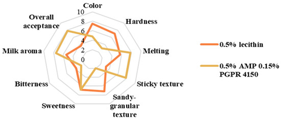 Overall acceptability was significantly higher for the AMP–PGPR -containing sample. While the lecithin-based chocolate had a slightly slower melt—an attribute sometimes associated with premium perception—it could not compensate for its reduced cohesion and less favorable mouthfeel [11,54]. These findings highlight AMP–PGPR’s potential in maintaining desirable sensory characteristics even at high CB replacement levels.