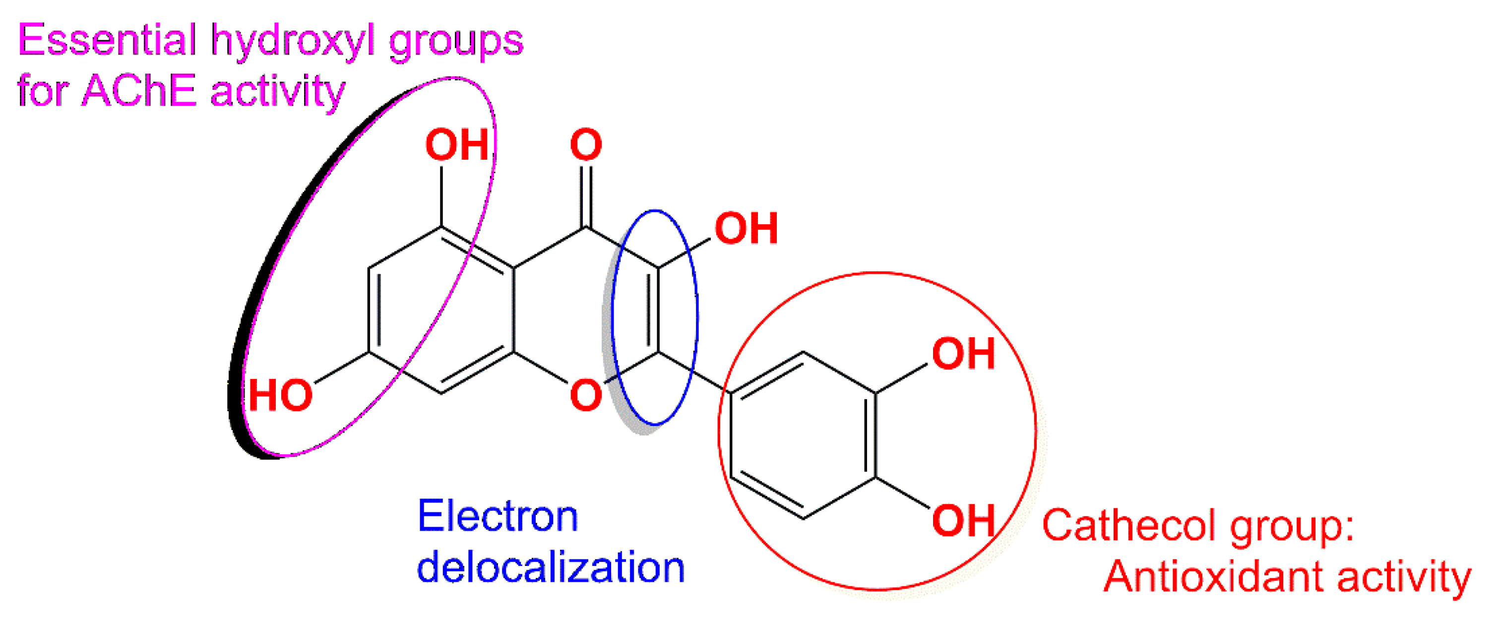 - Nam, G.; Hong, M.; Lee, J.; Lee, H.J.; Ji, Y.; Kang, J.; Baik, M.-H.; Lim, M.H. Structure–activity relationships and accelerated molecular dynamics reveal key catechol interactions of flavones/flavonols with acetylcholinesterase. Chem. Sci. R. Soc. Chem. 2020, 11, 10243–10254. [Google Scholar] [CrossRef]