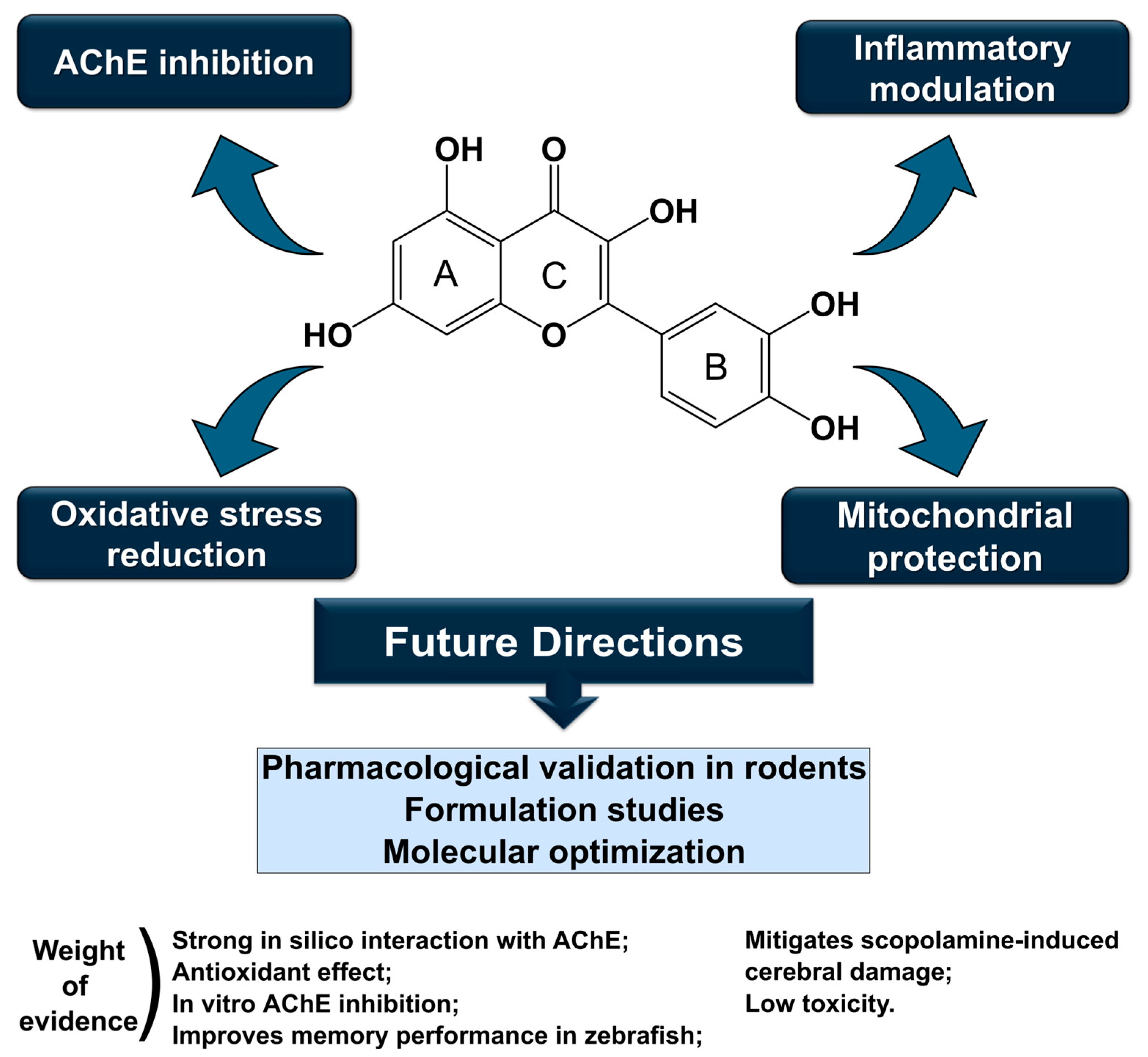 - Adnan, M.; Siddiqui, A.J.; Bardakci, F.; Surti, M.; Badraoui, R.; Patel, M. Neuroprotective potential of quercetin in Alzheimer’s disease: Targeting oxidative stress, mitochondrial dysfunction, and amyloid-β aggregation. Front. Pharmacol. 2025, 16, 1593264. [Google Scholar] [CrossRef]
