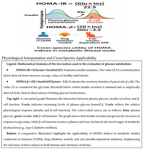 The HOMA (Homeostatic Model Assessment) index has become an essential tool for evaluating and monitoring metabolic disorders, particularly insulin resistance and pancreatic β-cell function [12,30,53]. Its applications extend beyond human medicine and are increasingly used in veterinary medicine, offering an accessible and efficient method for diagnosing and managing various endocrine and metabolic diseases, such as diabetes mellitus [54,55,56]. HOMA-IR (for insulin resistance) and HOMA-β (for β-cell function) are straightforward formulas that allow the assessment of these parameters using only fasting plasma glucose and insulin concentrations, eliminating the need for invasive or costly tests—making these methods especially useful in veterinary practice [25,57,58].