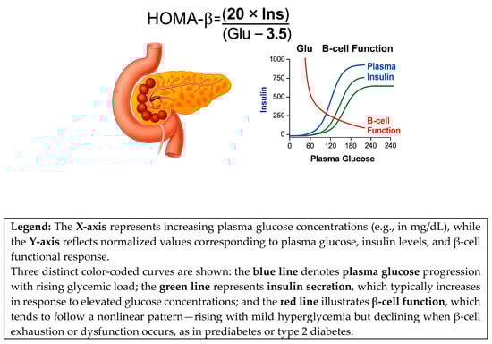 This calculation reflects the pancreas’s ability to secrete insulin in response to plasma glucose and insulin levels [14,67,68]. The method is useful for assessing the health status of β-cells, with significant applications in the diagnosis and therapeutic monitoring of diabetes mellitus [14,67,69], as illustrated in Figure 2.
