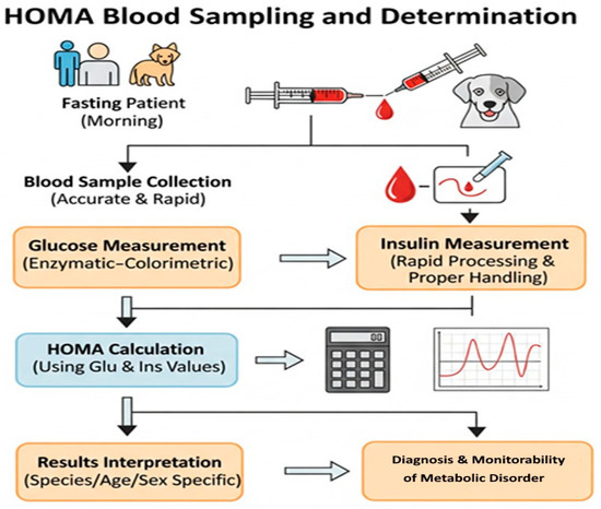 However, the method has limitations: it depends on strict adherence to fasting protocols and can be influenced by acute or chronic conditions. Establishing species-specific reference intervals and exploring the influence of external factors [diet, physical activity, chronic inflammation, medications] are necessary to refine its clinical utility [21,50]. Integrating HOMA values with other metabolic biomarkers—such as glycated hemoglobin (HbA1c), fructosamine, lipid profile, or C-peptide—can provide a holistic view of the metabolic status and guide therapeutic decision-making.