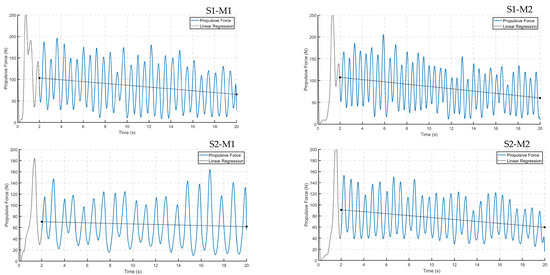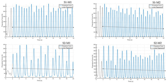 The data from both tests were collected using the system’s dedicated software (DB:4, Talamonti Spa, Ascoli Piceno, Italy). Subsequently, a custom routine (v. 0.5) developed in MATLAB (R2023b, MathWorks, Inc., Natick Apple Hill, MA, USA) was used for signal processing using a smooth filter (10 Hz) and an angular correction of 25°, taking into account the angle formed between the system and the water surface. This correction allowed for the accurate determination of the horizontal component of both the peak force (Fmax, N) and the mean force (Fmean, N). Instantaneous force values from the initial 2 s were excluded due to the initial cable tension.