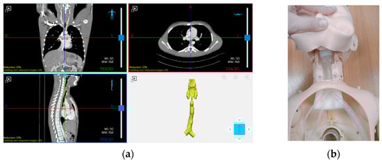 The anatomical model used in this study was based on real diagnostic imaging data of a pediatric patient. The tracheal region was extracted from high-resolution CT scans and processed using Materialise Mimics (Mimics Innovation Suite 26) [42], a specialized software for medical image segmentation (Figure 1a). Through segmentation procedures, the region of interest was isolated and reconstructed in 3D to serve as the basis for model fabrication. The resulting model was then integrated into a commercially available pediatric airway simulator, replacing the original airway component to enable realistic mechanical and functional testing (Figure 1b). For the purpose of evaluating its suitability for simulator integration, the anatomical portion considered included only the tracheal segment; the larynx and bronchial branches were excluded to focus on the region most commonly involved in surgical procedures.