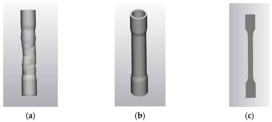 Specimen geometries: (a) anatomical; (b) cylindrical and (c) dog-bone shape of ISO 527-1A [iso1].