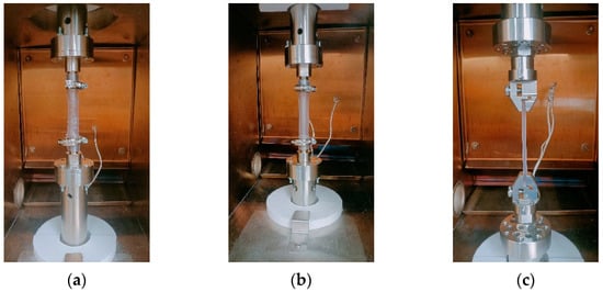 Once the initial length was set, the displacement between the grips was monitored by a High-Aspect-ratio Dielectric Sensor (HADS) installed directly on the machine with a measurement uncertainty of ±0.025 mm. All specimens were positioned in the testing machine in vertical orientation, with their longitudinal axis aligned with the direction of applied tensile load. Figure 4 shows the clamping arrangement for the three geometries.
