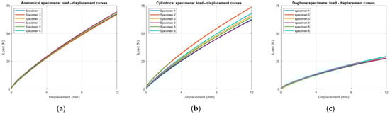 Raw load–displacement data from quasi-static tensile tests for the six specimens of each geometry: (a) anatomical, (b) cylindrical, and (c) ISO 527-1A dog-bone shape.
