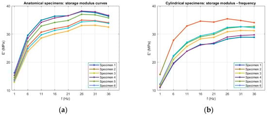 Raw storage modulus (E′) data as a function of frequency for (a) anatomical and (b) cylindrical specimens.