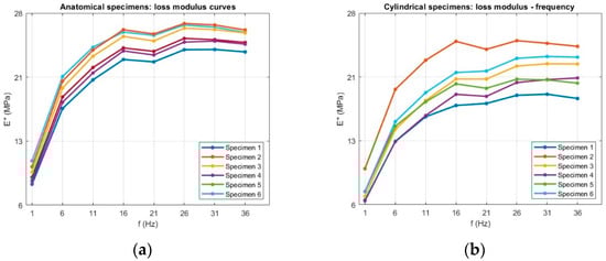 Raw loss modulus (E″) data as a function of frequency for (a) anatomical and (b) cylindrical specimens.