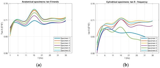 Raw loss factor (tan δ) data as a function of frequency for (a) anatomical and (b) cylindrical specimens.