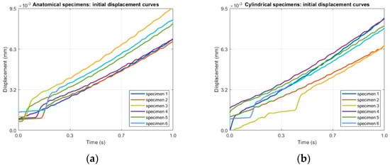 Raw displacement–time data under a constant tensile load of 10 N from Step 1 (high-frequency acquisition at 1200 Hz for 1 s) for (a) anatomical specimens and (b) for cylindrical specimens.
