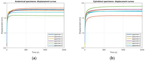 Raw displacement–time data from Step 2 (long-duration acquisition at 0.01 Hz over 2400 s) for (a) anatomical specimens and (b) cylindrical specimens.