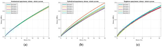 Static tensile tests were performed to evaluate the elastic and deformation behavior of the materials under low-rate loading conditions. A maximum elongation of 12 mm was applied to each specimen, in accordance with the stroke limitations of the testing machine. This elongation corresponds to a strain of less than 20% of each initial specimen length, ensuring consistency with values reported in the literature for similar applications and avoiding failure of the specimens during testing [47]. In particular, a strain of approximately 16% for both the anatomical and cylindrical specimens, and approximately 10% for the standard one were achieved. The latter has a lower percentage elongation due to the higher initial length of the test sample. The elongation was applied at a constant rate of 0.16 mm/s.