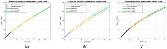 Stress–strain curves were obtained from the data recorded during quasi-static tensile tests using the WinTest®(WinTest 7 Software) proprietary software of the testing machine. Post-processing was conducted in MATLAB 2023a to analyze and quantify the material’s elastic response. To estimate the Young’s modulus, an average stress–strain curve was computed from the six individual curves by interpolating stress values at equal strain intervals. The variability among samples was quantified by computing the standard deviation (SD) of stress at each strain level, allowing assessment of the test repeatability. A weighted linear regression approach [43] was employed to approximate the average curve with a series of linear segments. The weighting was based on the measured SD of stress for each sample, ensuring that data with lower uncertainty contributed more significantly to the fit. From this piecewise linear approximation, the Young’s modulus was estimated as the slope of each segment. Specifically, a polynomial function of degree m was first fitted to the average curve to identify n optimal intervals, each corresponding to a distinct segment. From each segment, the elastic modulus value Ei (i = 1, …, n) was extracted as a function of the corresponding strain range.
