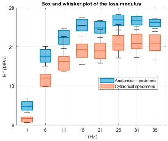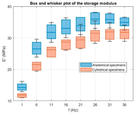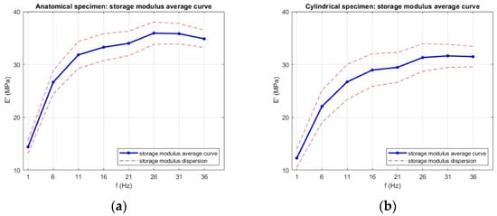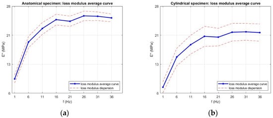 For anatomical and cylindrical specimen type, dynamic mechanical data were acquired from six individual tests using the WinTest® proprietary software. During each test, the system imposed the sinusoidal displacement profile as indicated in Section 3.3. and, based on the input geometrical parameters of the specimens, directly computed the storage modulus (E′) and loss modulus (E″). The loss factor (tan δ) was obtained as the ratio E″/E′.