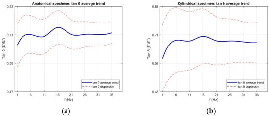The loss factor (tan δ) results are shown in Figure 17. For both specimen types, tan δ increased to a well-defined peak at approximately 16 Hz, followed by a gradual decrease or plateau at higher frequencies. Anatomical specimens reached a maximum of 0.74 ± 0.07, while cylindrical specimens peaked at 0.71 ± 0.11 before leveling off above 21 Hz. A peak in tan δ indicates the frequency range at which the material maximizes energy dissipation relative to energy storage. From a mechanical standpoint, this corresponds to a condition where internal molecular motions and microstructural rearrangements are optimally synchronized with the loading cycle, allowing viscous mechanisms to dominate over elastic ones at room temperature. Beyond this range, the reduced time available for molecular movement leads to a more elastic-like response and lower tan δ values. As observed for E′ and E″, specimen geometry influenced the magnitude and stability of tan δ across the frequency range, with anatomical specimens showing slightly higher average values. The greater data dispersion found in cylindrical specimens for E′ and E″ was also reflected in their tan δ values.